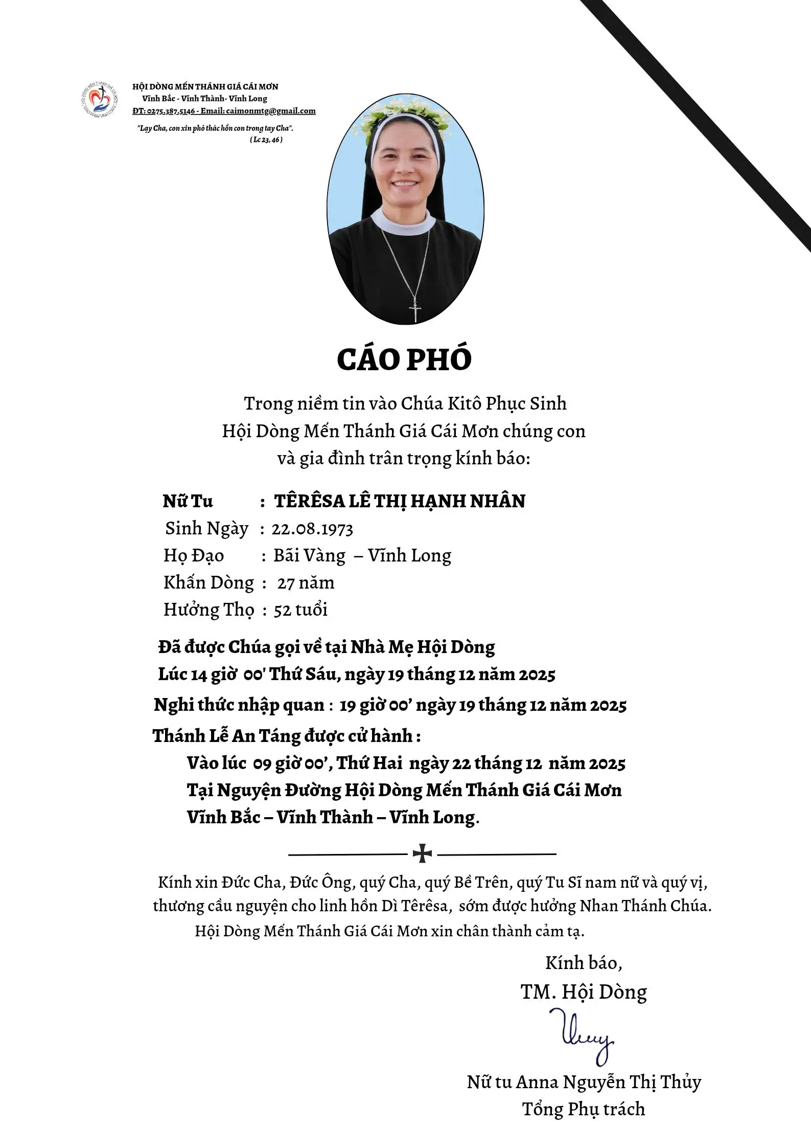 TIN BUỒNCáo Phó Nữ Tu Têrêsa Lê Thị Hạnh Nhân Đăng vào 19/12/2025 bởi Hội Dòng Mến Thánh Giá Cái Mơn Tin liên quan:Cáo Phó Nữ Tu Maria Nguyễn Thị HảiCáo Phó Nữ Tu Maria Lưu Thị ThêuCáo Phó Nữ Tu Anê Lê Thị LễCáo Phó Nữ Tu Maria Trần Thị ThiệtCáo Phó Nữ Tu Anna Lê Thị Sinh 27