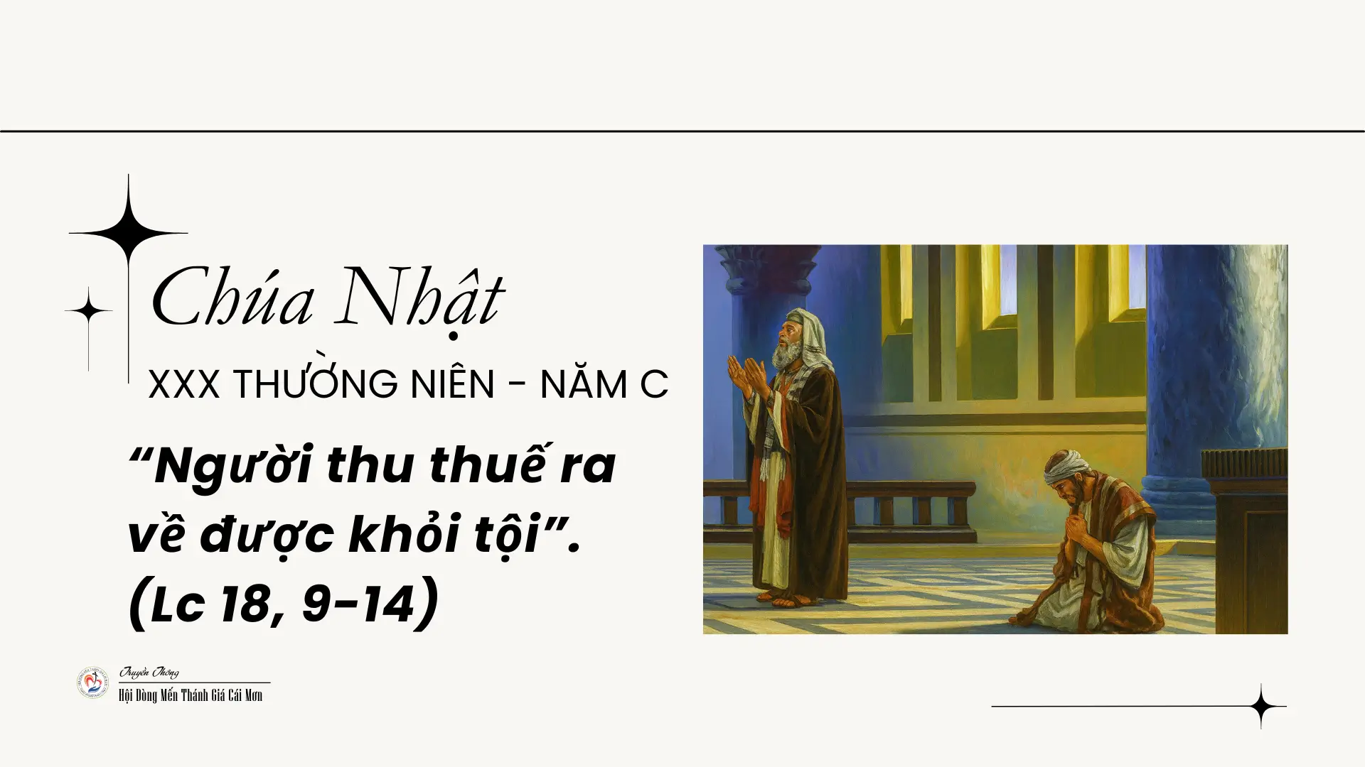 Khi chiêm ngắm khung cảnh Tin Mừng, ta hiểu rõ hơn lời cảnh tỉnh ấy. Đức Giêsu kể dụ ngôn hai người lên đền thờ cầu nguyện: một người biệt phái và một người thu thuế. Người biệt phái là mẫu người đạo đức, giữ lề luật nghiêm túc, ăn chay, dâng thuế thập phân đầy đủ. Nhưng ông lại mang thái độ tự mãn, lấy mình làm chuẩn mực cho sự đạo đức và coi thường kẻ khác. Trái lại, người thu thuế bị xã hội khinh rẻ, bị xem là tội nhân. Thế nhưng, ông lại cúi đầu khiêm tốn, nhận ra thân phận yếu hèn và chân thành nài xin: “Lạy Chúa, xin thương xót con là kẻ có tội.”