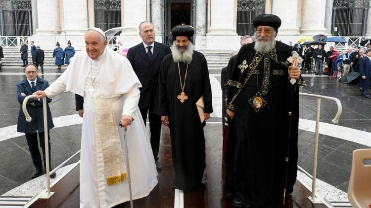 Sau lời chào của Đức Thượng phụ Tawadros II, Đức Thánh Cha nói với các tín hữu: “Hôm nay tôi vô cùng vui mừng chào đón Đức Thượng phụ Tawadros II, Giáo chủ của Alexandria và Thượng phụ của Ngai Tòa Thánh Marco, và phái đoàn tháp tùng ngài.”