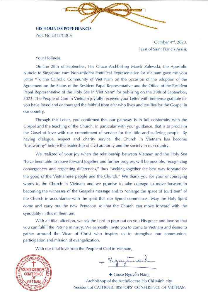 WHĐ (27.10.2023) – Ngày 29 tháng 9 vừa qua, Hội đồng Giám mục Việt Nam phổ biến Thư của Đức Giáo Hoàng Phanxicô “gửi cộng đoàn Công giáo Việt nam nhân dịp công nhận Thoả thuận về Qui chế cho Đại diện thường trú của Toà Thánh và Văn phòng Đại diện thường trú của Toà Thánh tại Việt Nam”. Ngày 04 tháng 10 năm 2023, Đức Tổng Giám mục Giuse Nguyễn Năng, Chủ tịch Hội đồng Giám mục Việt Nam đã thay mặt cho Giáo hội tại Việt Nam viết Thư gửi Đức Thánh Cha Phanxicô.