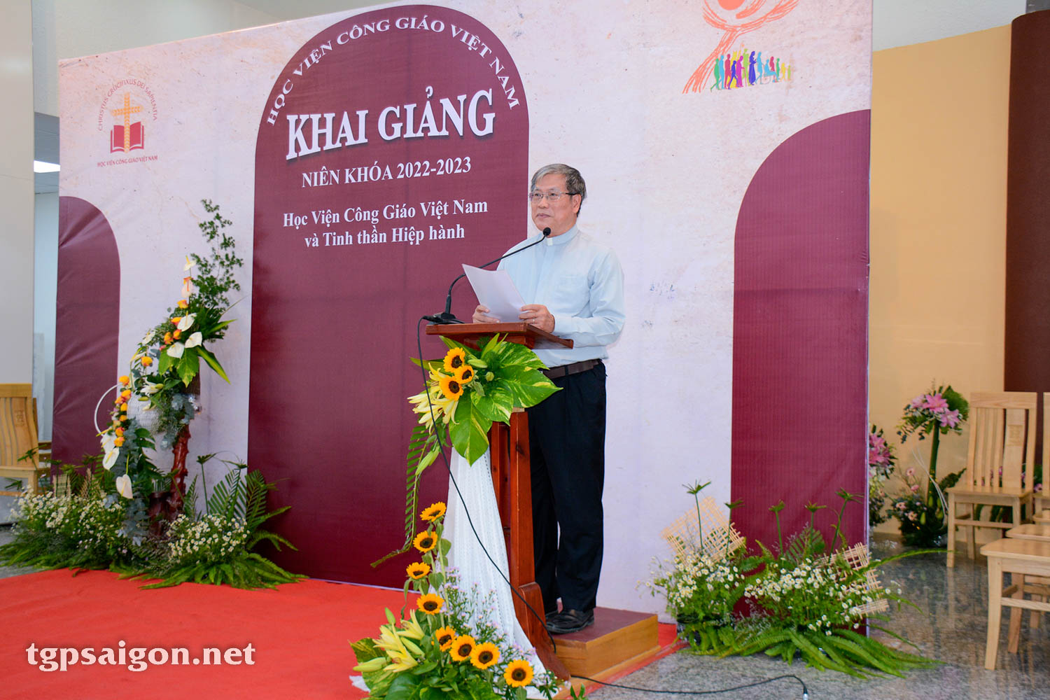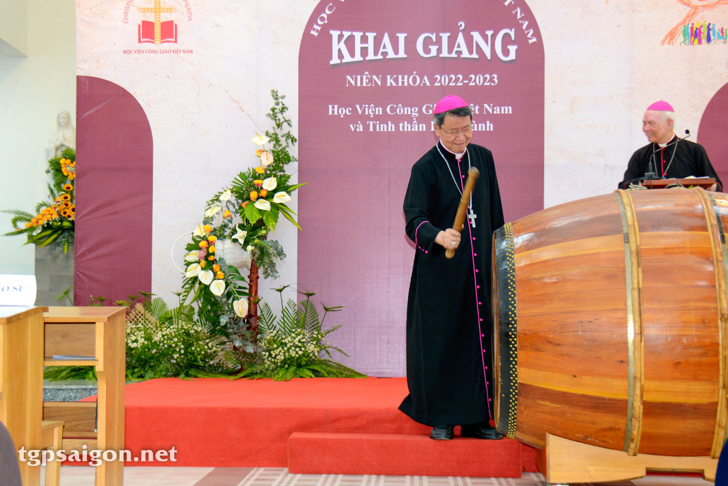 Sau đó, Đức Cha Viện Trưởng đã tuyên bố khai giảng năm học: “Với năng quyền của Tòa Thánh và thay mặt Đức Cha Chưởng ấn HVCGVN, tôi chính thức công bố khai giảng năm học 2022-2023 của HVCGVN”; lập tức Đức Cha Phêrô Nguyễn Văn Khảm đã gióng lên hồi trống, hòa cùng tiếng vỗ tay của mọi người.
