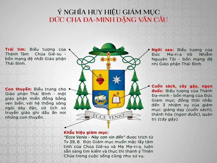 Cuốn sách, cây gậy, ngọn đuốc: Biểu tượng của Thánh Đa-minh – bổn mạng của Đức Giám mục; đồng thời nhắc đến 3 nhiệm vụ của giám mục: giảng dạy (cuốn sách), thánh hóa (ngọn đuốc), quàn trị (cây gậy).