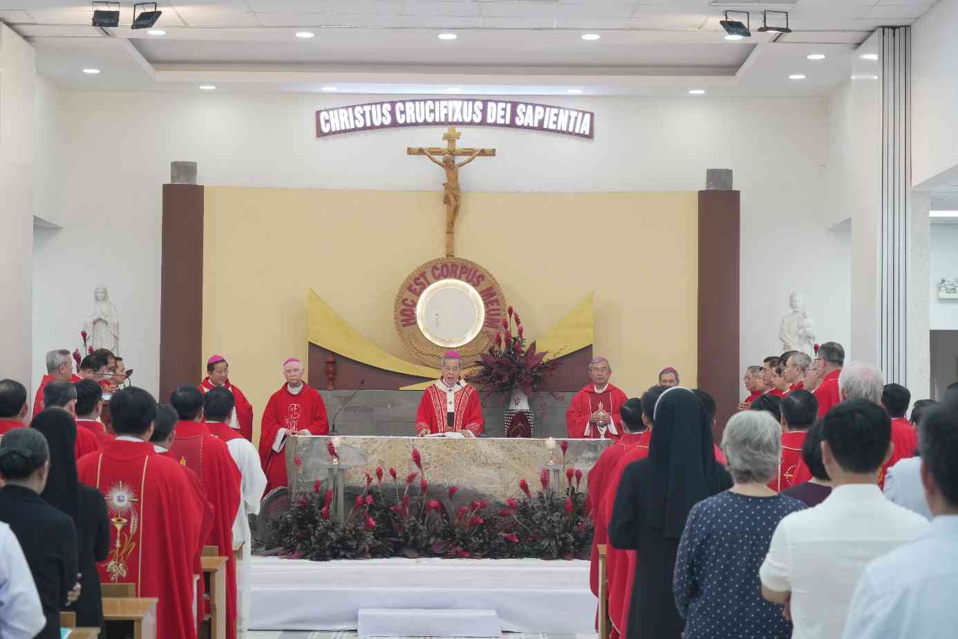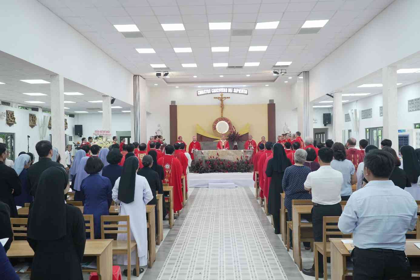 Thánh lễ do Đức Tổng Giuse Nguyễn Năng chủ tế. Cùng dâng lễ có tất cả các giám mục, linh mục, tu sĩ và giáo dân hiện diện trong Nghi thức công bố Quy chế mới của HVCG.