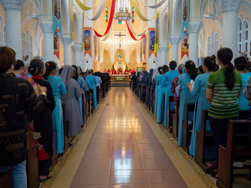 Chị Anna Nguyễn Thị Yến Trâm, Tổng Phụ trách Hội dòng Mến Thánh Giá Qui Nhơn, tiến vào Tiền sảnh Nhà thờ Chính Tòa và trao hũ Hài cốt Đức cha Lambert cho Đức cha Matthêô Nguyễn Văn Khôi, Giám mục Giáo phận Qui Nhơn.