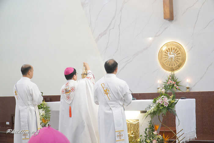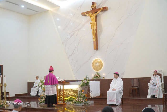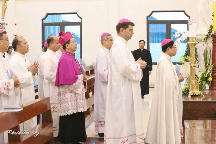 Lúc 17g30, đoàn rước Giám mục tiến lên cung thánh, sau đó ĐGM Đaminh Đặng Văn Cầu đã long trọng chủ sự Phụng vụ Giờ Kinh Chiều.