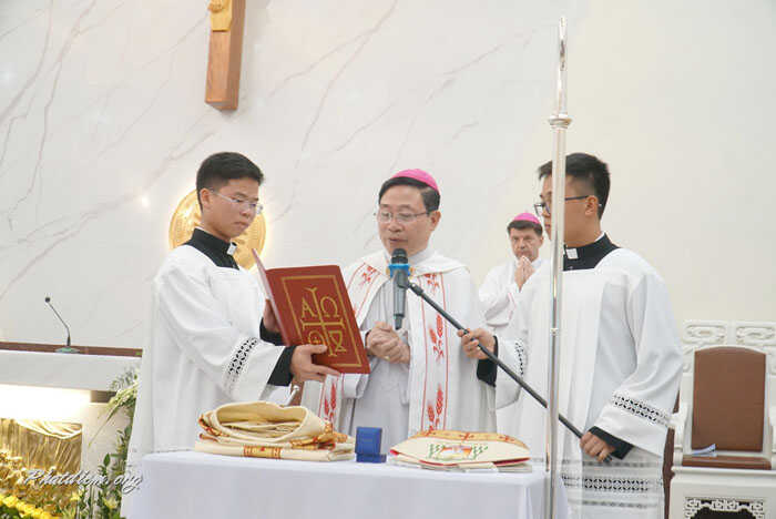Dứt lời, ĐGM tân cử tiến lên đặt tay trên Sách Thánh và đọc: “Vì vậy, xin Thiên Chúa và các sách Tin Mừng tôi đặt tay đây giúp sức cho tôi”.