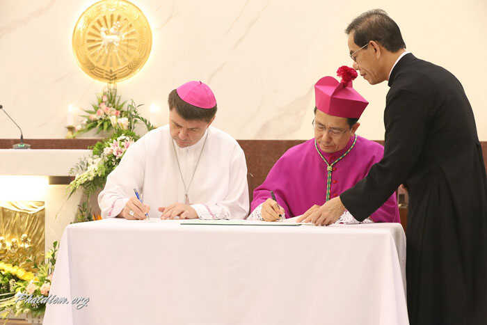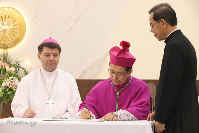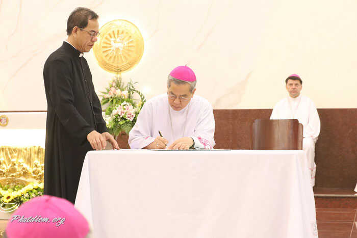 Sau Kinh Lạy Cha và lời nguyện cuối cùng của Kinh Chiều, Đức Giám mục tân cử Phêrô, Đức TGM Marek Zalewski và Đức TGM Giuse Nguyễn Năng đã ký tên vào bản tuyên xưng Đức tin mà vị Giám mục tân cử vừa đọc.