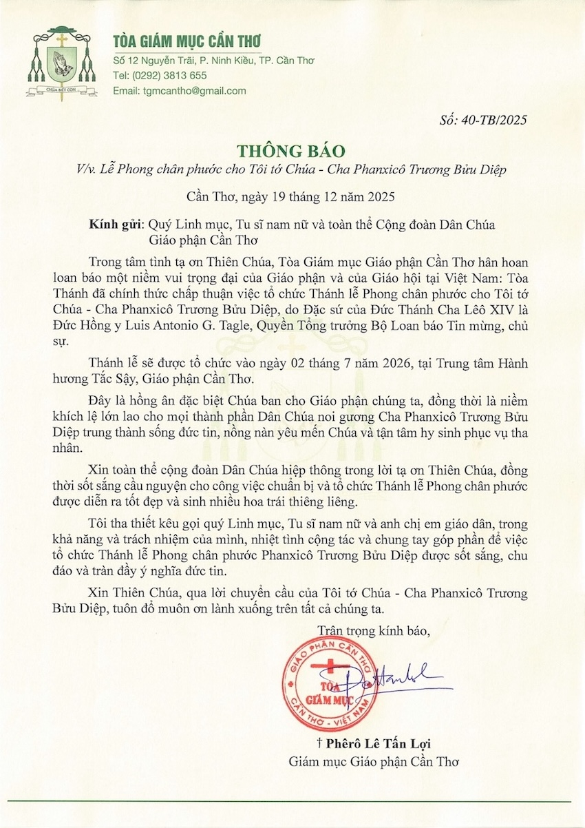 Trong tâm tình tạ ơn Thiên Chúa, Tòa Giám mục Giáo phận Cần Thơ hân hoan loan báo một niềm vui trọng đại của Giáo phận và của Giáo hội tại Việt Nam: Tòa Thánh đã chính thức chấp thuận việc tổ chức Thánh lễ Phong chân phước cho Tôi tớ Chúa – Cha Phanxicô Trương Bửu Diệp, do Đặc sứ của Đức Thánh Cha Lêô XIV là Đức Hồng y Luis Antonio G. Tagle, Quyền Tổng trưởng Bộ Loan báo Tin mừng, chủ sự.